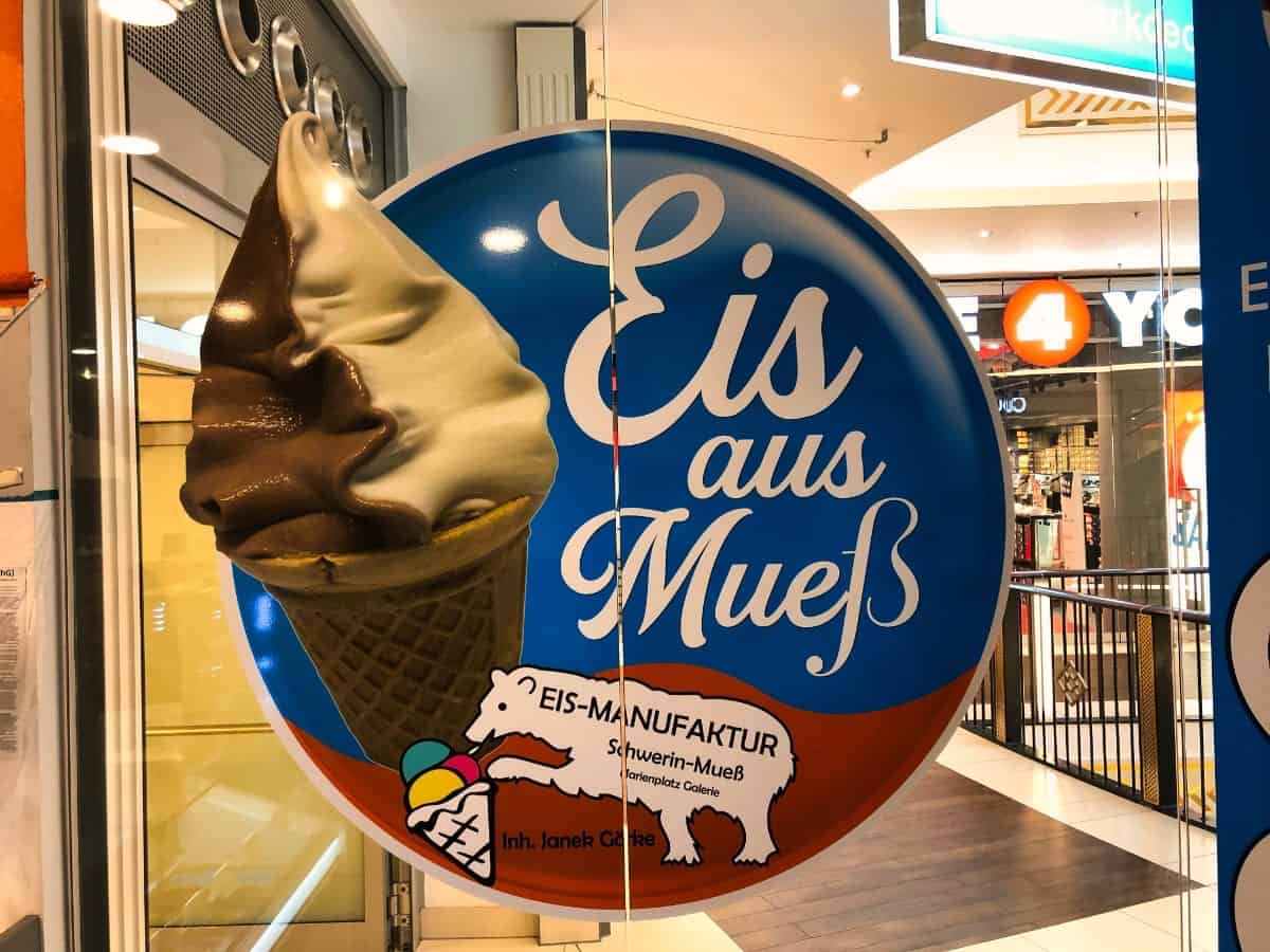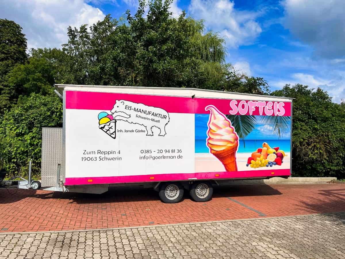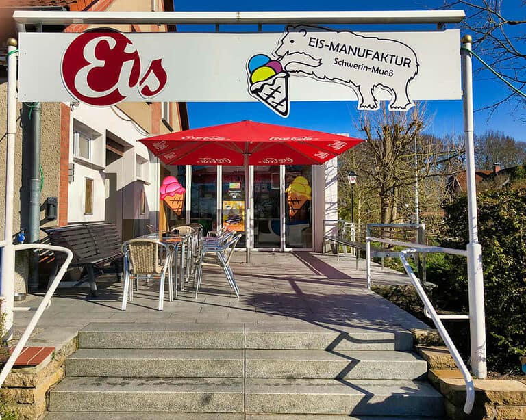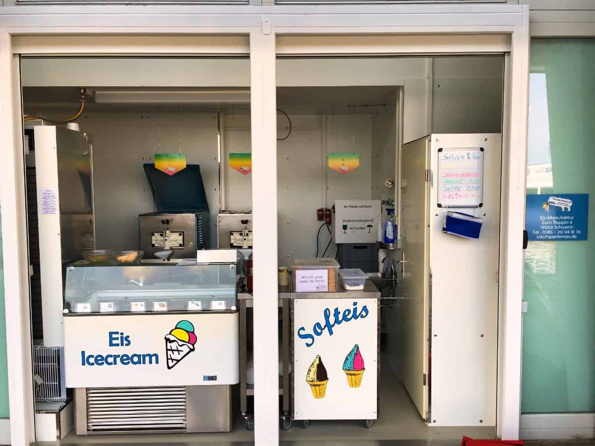 Softeis gibt es nun in direkter Nachbarschaft zum Fahrkartenverkauf der WEISSEN FLOTTE Schwerin. Von Ostern bis zum 3. Oktober gab es täglich von 11-18 Uhr Softeis und Kugeleis „Made in Mueß“.